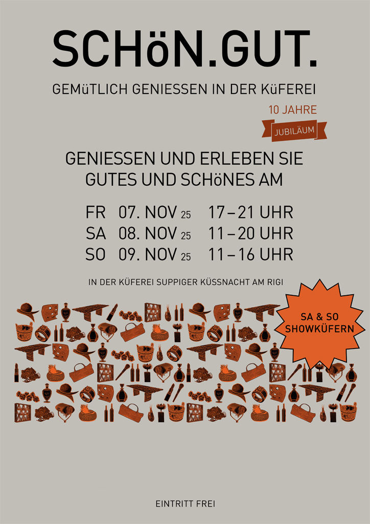 Kaum zu Glauben – vor 10 Jahren ist die Idee für eine Ausstellung der etwas anderen Art entstanden. Heute können wir mit Stolz verkünden, dass es anlässlich dieses 10-jährigen Jubiläums wieder einen 3-tägigen Anlass in der Werkstatt der Küferei Suppiger in Küssnacht am Rigi geben wird. Die Schön.Gut. ist keine gewöhnliche Messe, es ist eher eine Hommage an altes, traditionelles Handwerk und an die Kreativität unserer Aussteller. Jeder von ihnen ist mit viel Herzblut und Leidenschaft bei der Sache und Sie als Besucher haben die Möglichkeit, in einer einzigartigen Atmosphäre hochqualitative Produkte – eben Schönes und Gutes – direkt vom Produzenten zu erwerben.